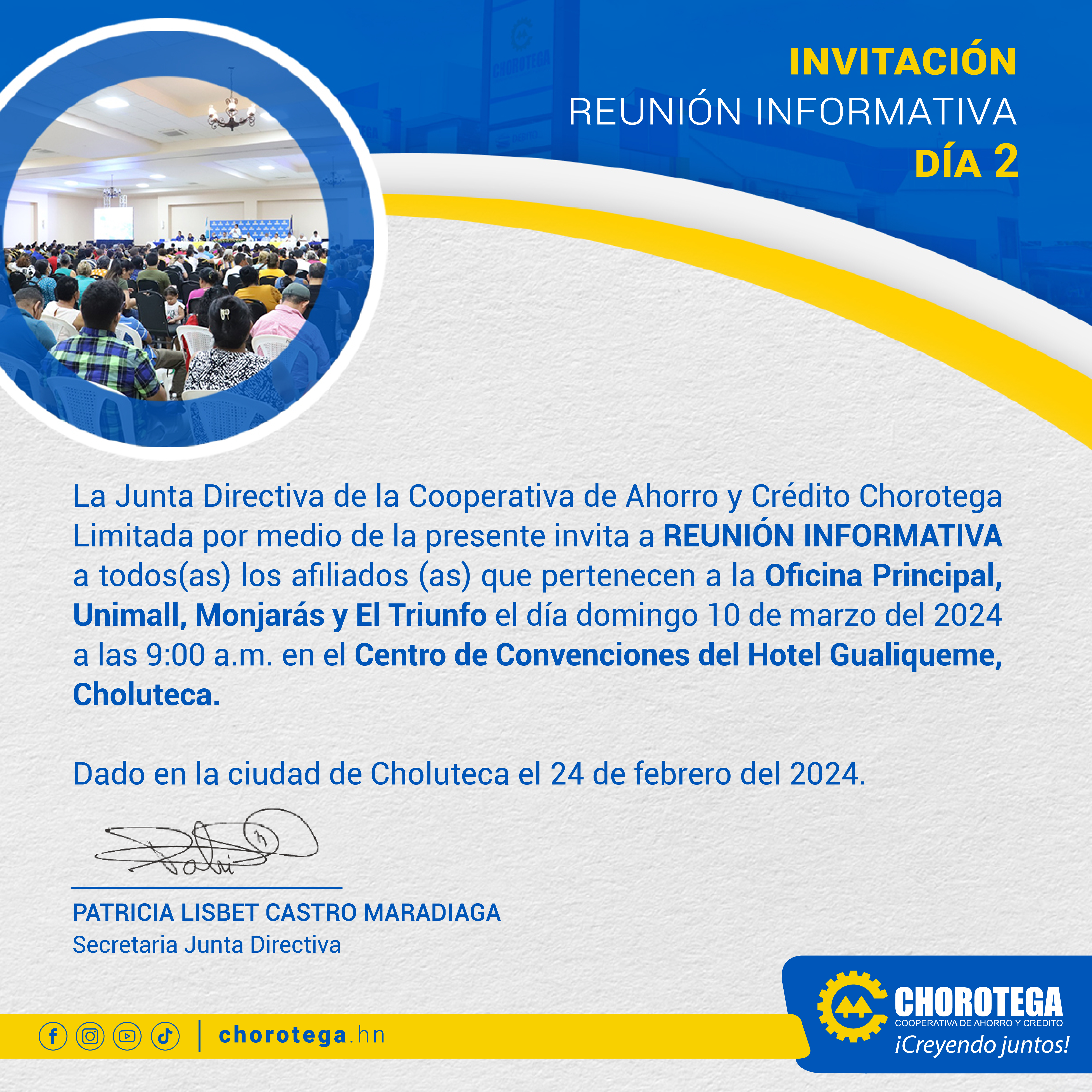 Junta Directiva les invita a la Reunión Informativa a todos (as) los afiliados (as) de Oficina Principal, Unimall, Monjarás y El Triunfo el día sábado 09 de marzo a la 1:00 p.m. y el domingo 10 de marzo a las 9:00 a.m. en el Centro de Convenciones del Hotel Gualiqueme, Choluteca. Sólo deberá asistir a uno de los dos días.