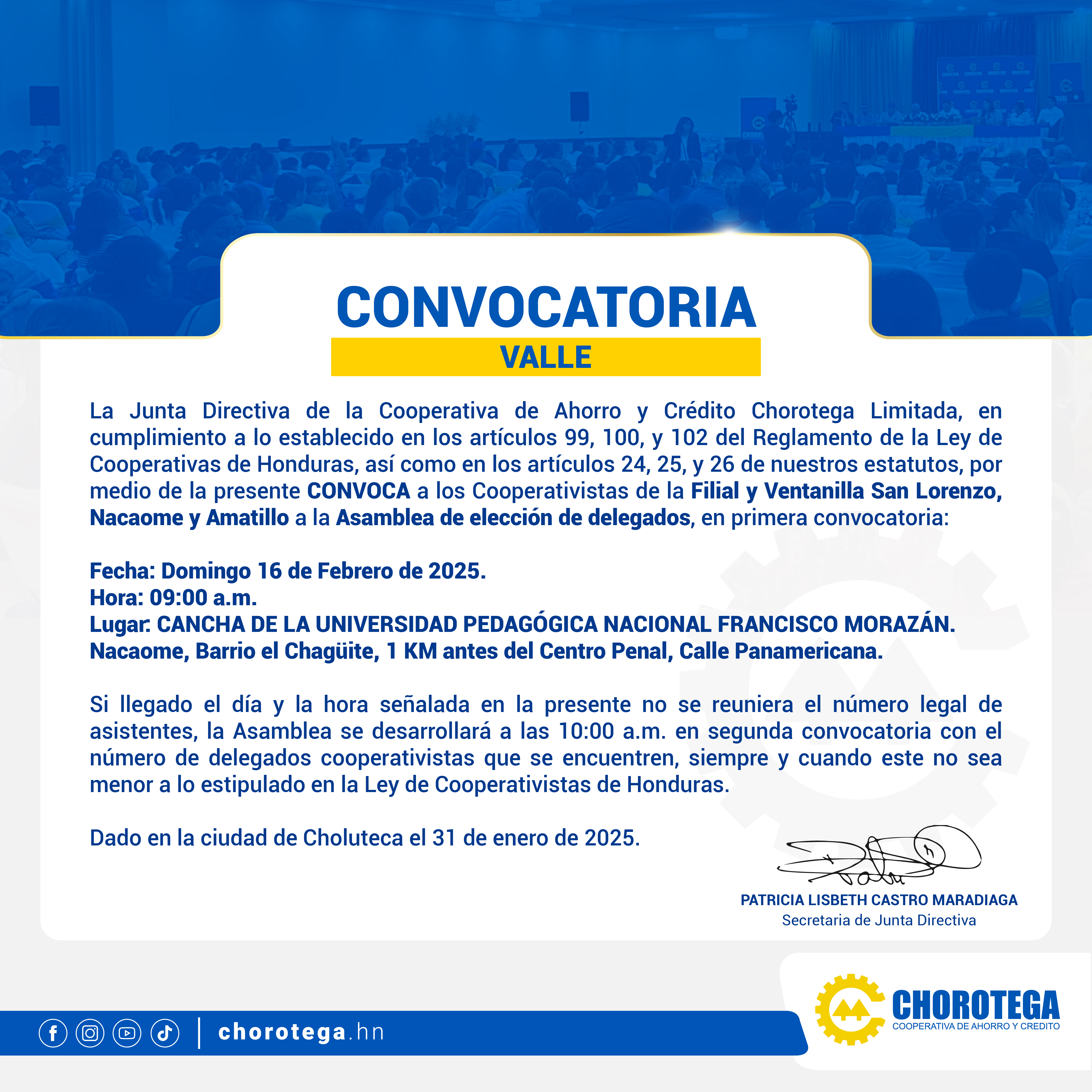 Se les convoca a la Asamblea elección de delegados, a celebrarse el día domingo 16 de febrero del 2025, a partir de las 9:00 a.m. en primera convocatoria, en Cancha de la Universidad Pedagógica Nacional Francisco Morazán, Nacaome, Barrio el Chagüite, 1 KM antes del Centro Penal, Calle Panamericana.