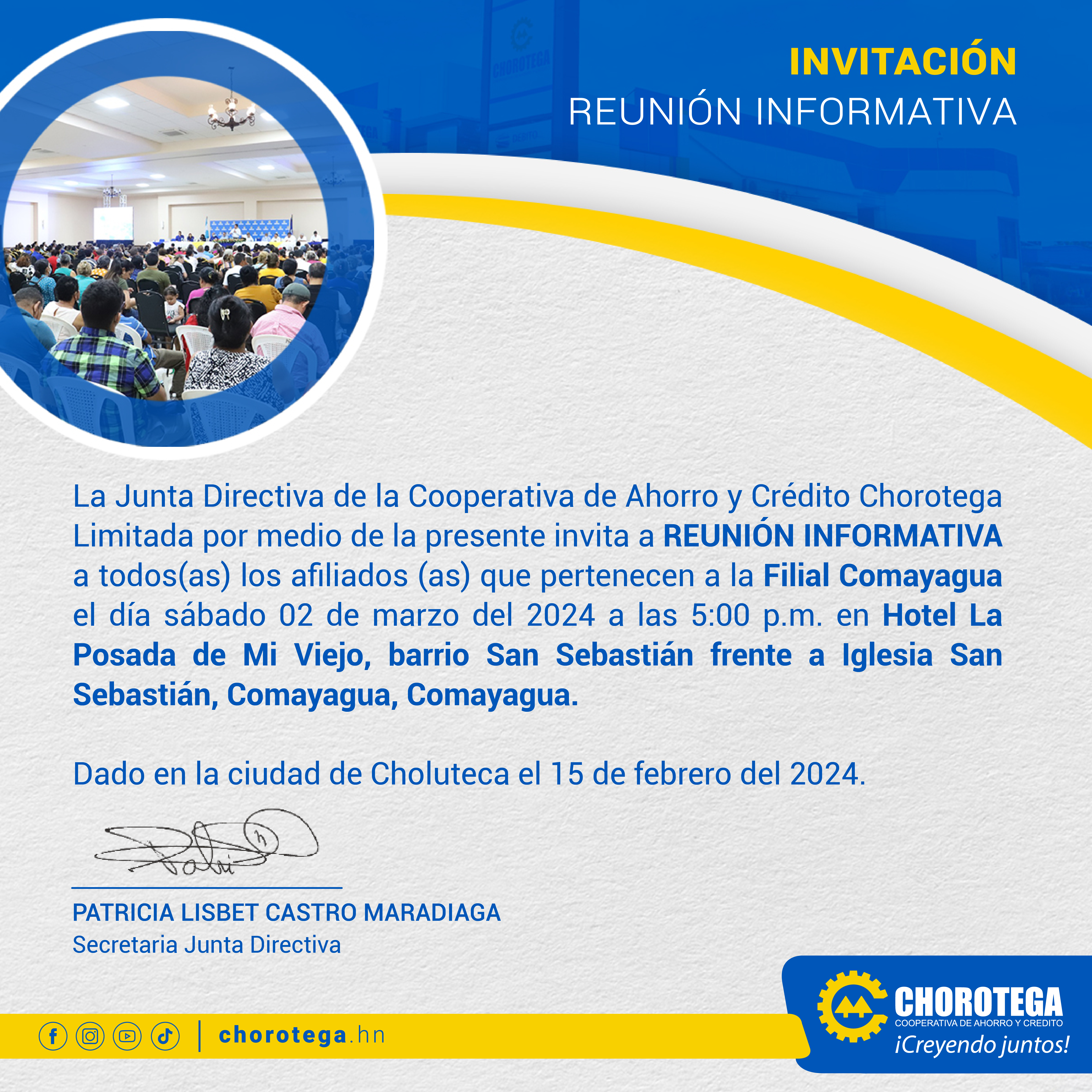Junta Directiva les invita a la Reunión Informativa a todos (as) los afiliados (as) de Filial Comayagua el día sábado 02 de marzo a partir de las 5:00 p.m. en Hotel La Posada de Mi Viejo, barrio San Sebastián frente a Iglesia San Sebastián, Comayagua, Comayagua.